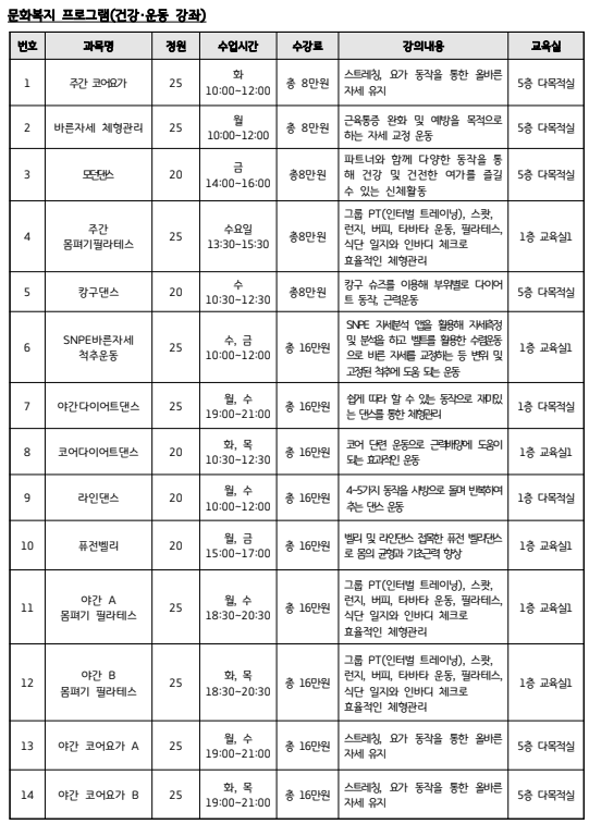 ○ 교육시간 : 매주 월 ~ 금 / 10:00 ~ 21:00 (강좌별 상이), 첨부파일 참조 교육인원 : 10명 ~ 40명 (강좌별 상이), 첨부파일 참조