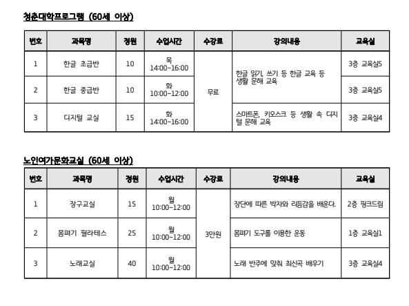 / 노인여가문화교실(시니어 장구교실 외 2강좌) / 청춘대학프로그램(한글교실 초급반 외 2강좌)