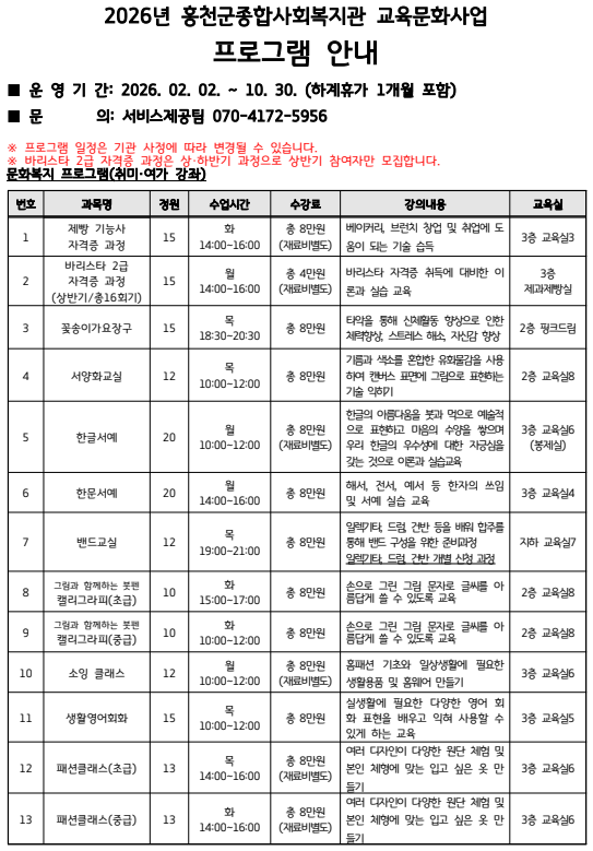 공지 [공지사항] 2026년 교육문화사업 프로그램 (제빵 기능사 자격 과정 외 32강좌) 수강생 모집