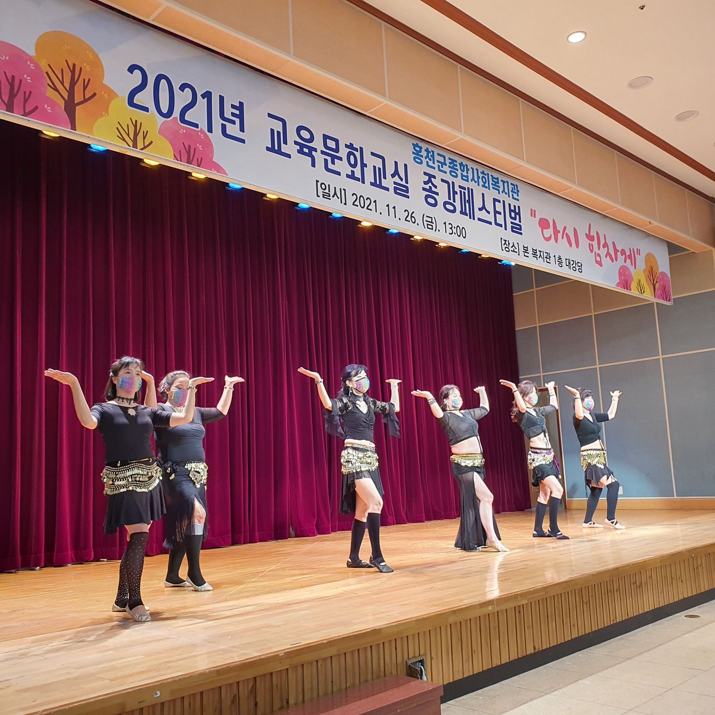 내용: 교육문화교실 종강페스티벌 "다시 힘차게"가 개최 되었습니다. 성인문해교실, 라인댄스, 장구교실, 코어댄스, 벨리댄스의 작품 공연과 성인문해교실, 서양화교실, 옷 만들기, 프랑스자수, 한문기초서예, 한글기초서예팀의 작품 전시도 진행 되었습니다. 작품 전시는 12월 3일까지 진행 됩니다.