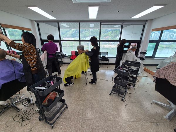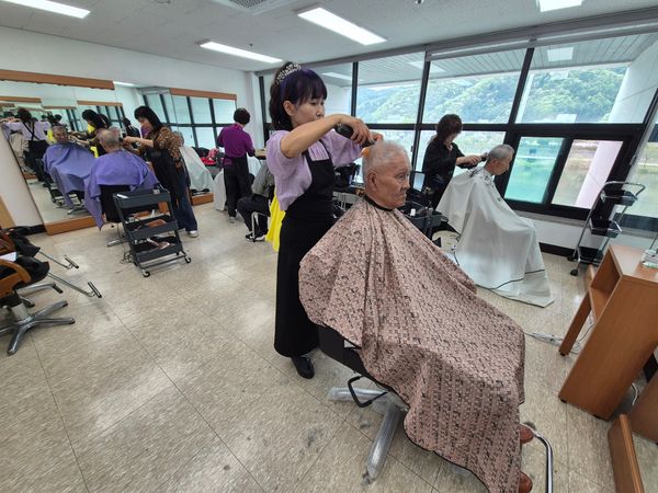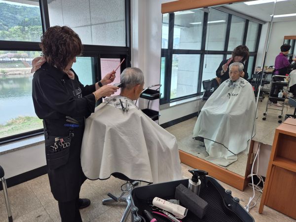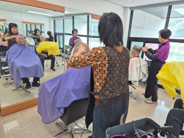 보내셨습니다. 머리 손질을 마친 후에는 거울을 보며 만족스러운 미소를 지으시고, 주변 어르신들과 자연스럽게 이야기를 나누는 모습이