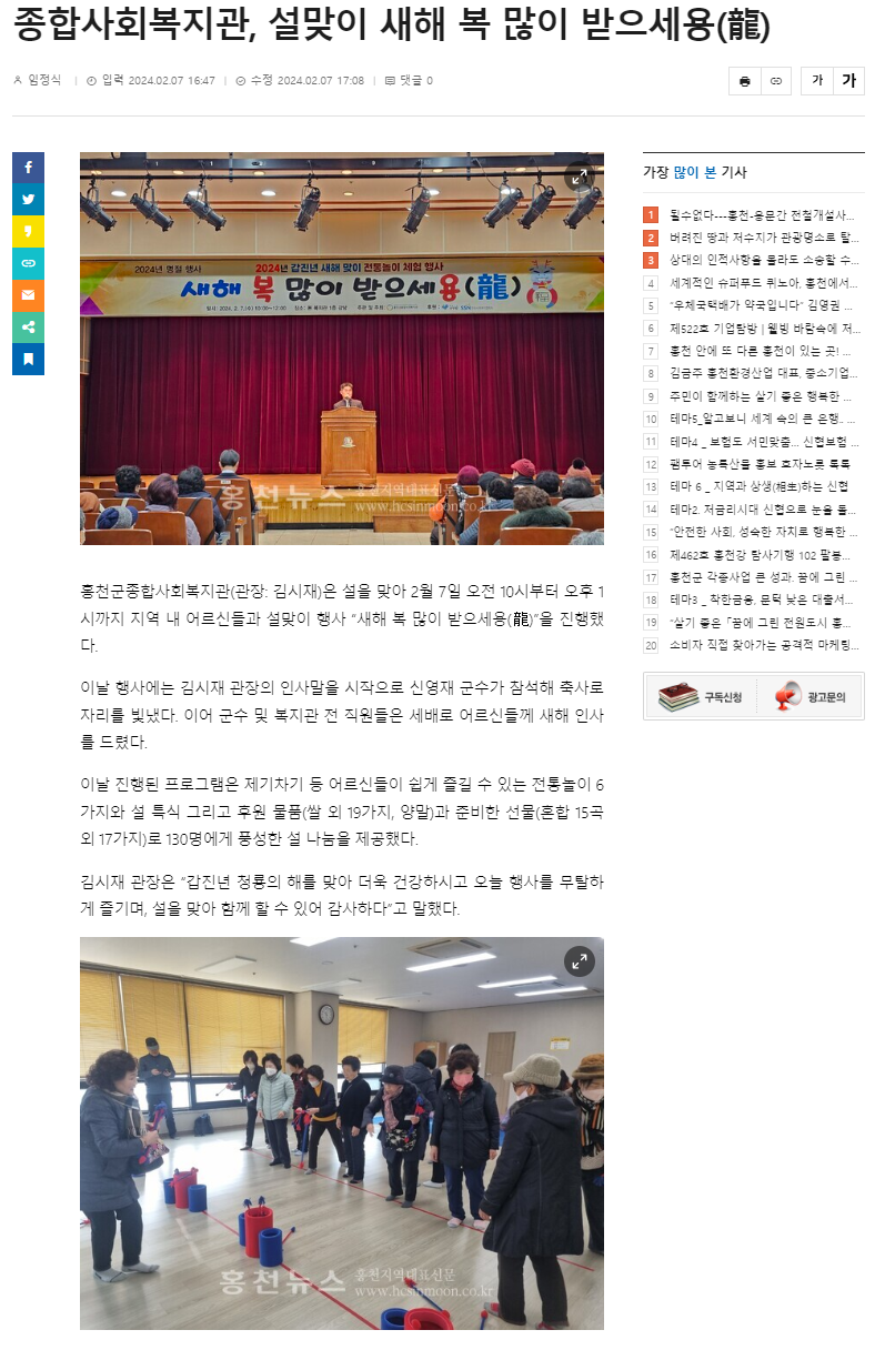 - 이전글 홍천뉴스_종합사회복지관, 자유총연맹 여성회와 업무협약 2024.02.07