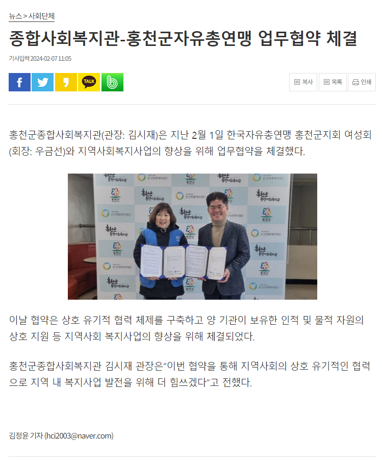 - 다음글 강원일보_[포토뉴스]홍천군종합사회복지관-한국자유총연맹 홍천군지회 여성회 업무협약 2024.02.07