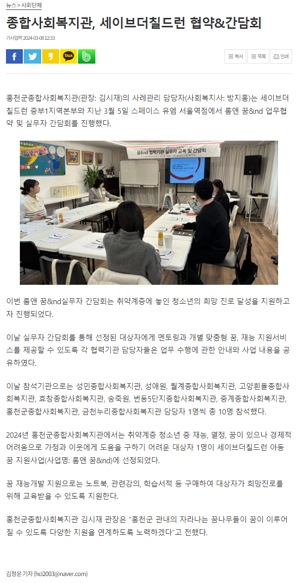 홍천인터넷뉴스_종합사회복지관, 세이브더칠드런 협약&간담회