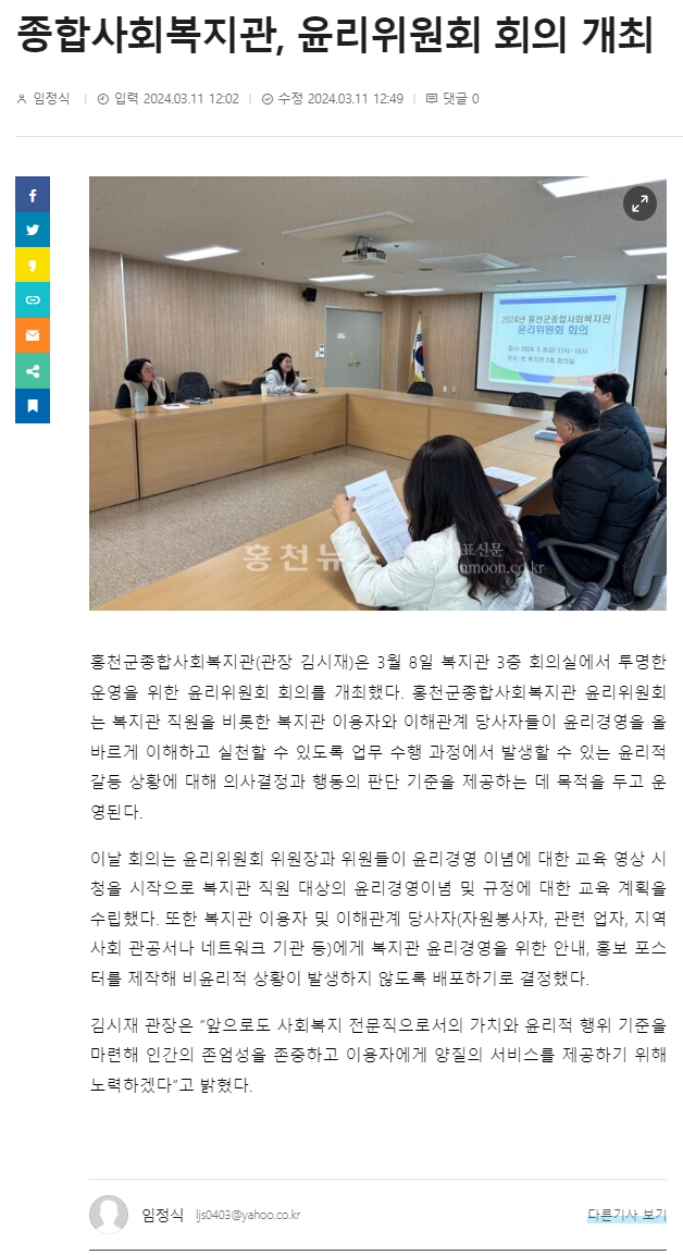 - 다음글 강원일보_[포토뉴스]홍천종합사회복지관 윤리위원회 회의 개최 2024.03.11