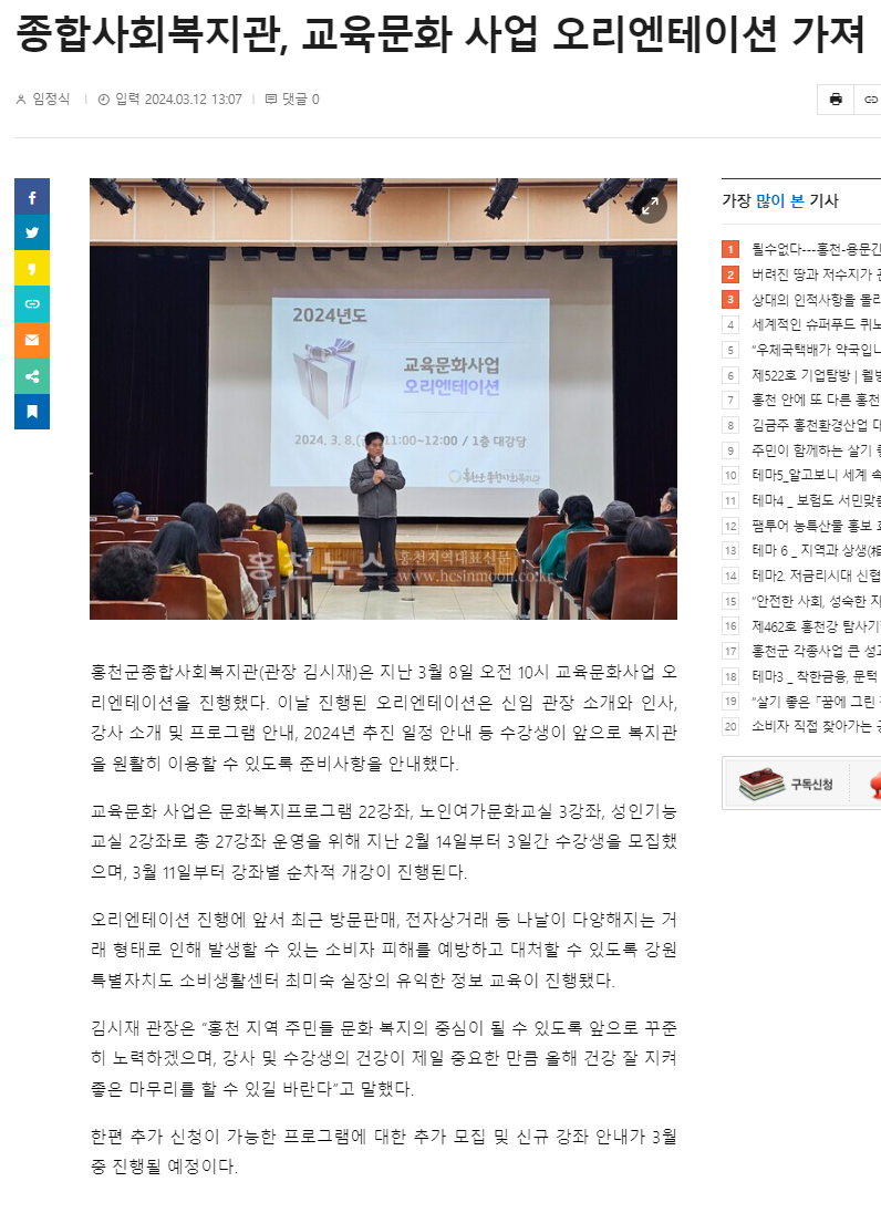 - 다음글 홍천뉴스_종합사회복지관, 복지사각지대 발굴단 사업설명회 진행 2024.03.15