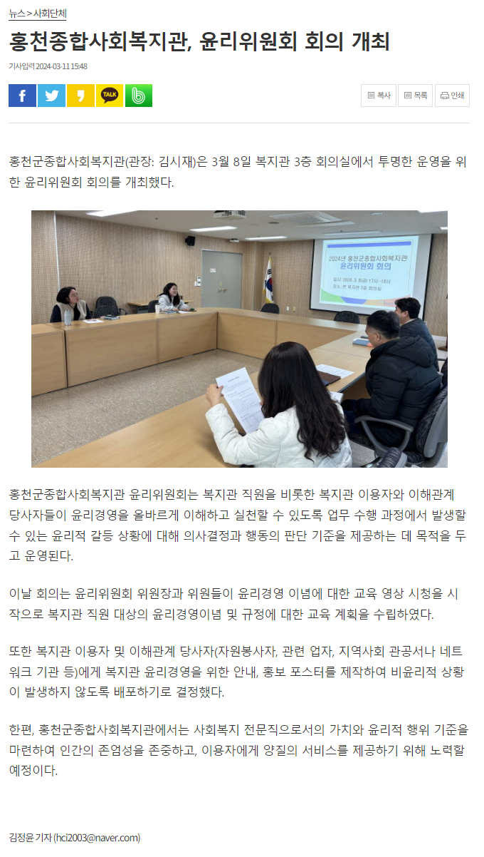 홍천인터넷뉴스_홍천군종합사회복지관, 윤리위원회 회의 개최