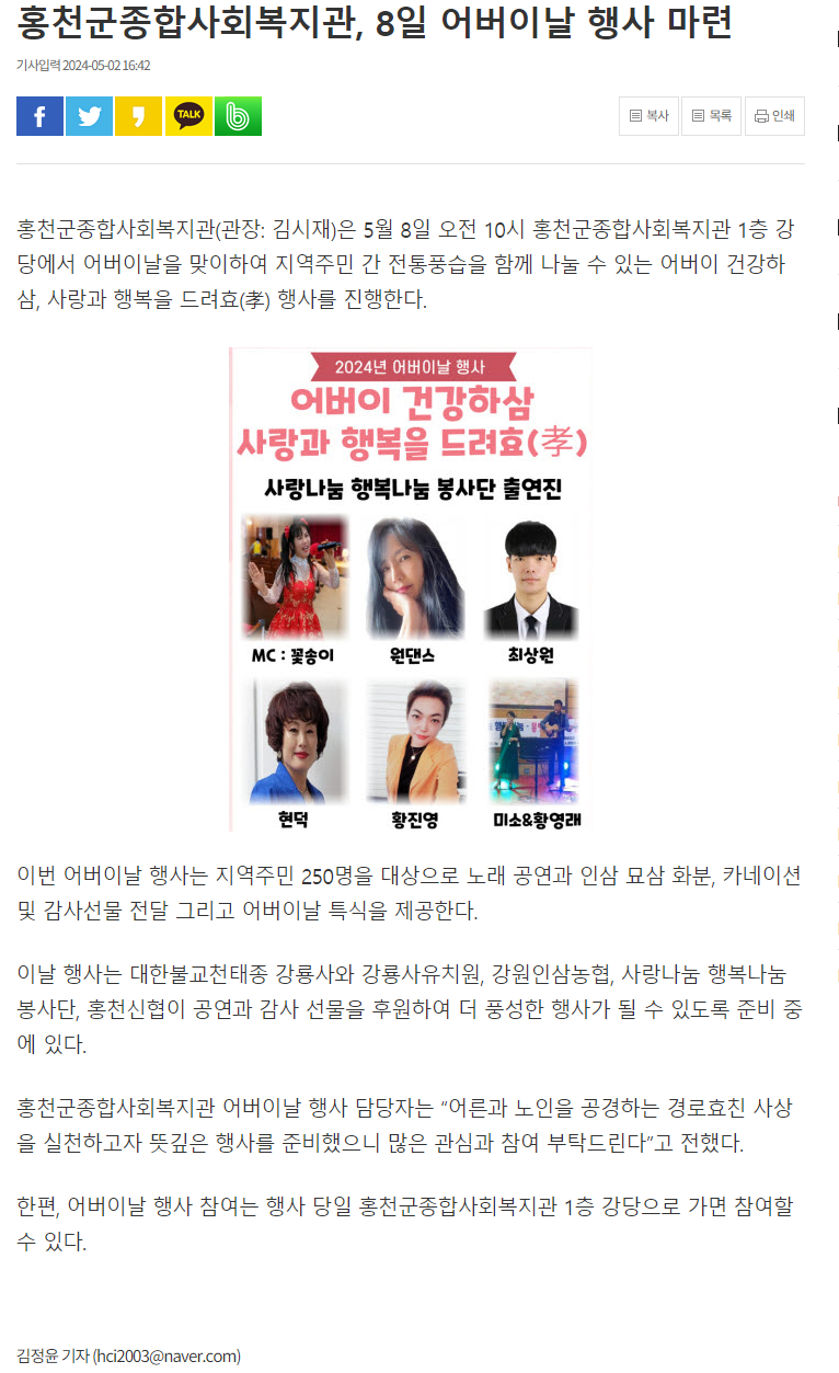 홍천인터넷뉴스_홍천군종합사회복지관, 8일 어버이날 행사 마련