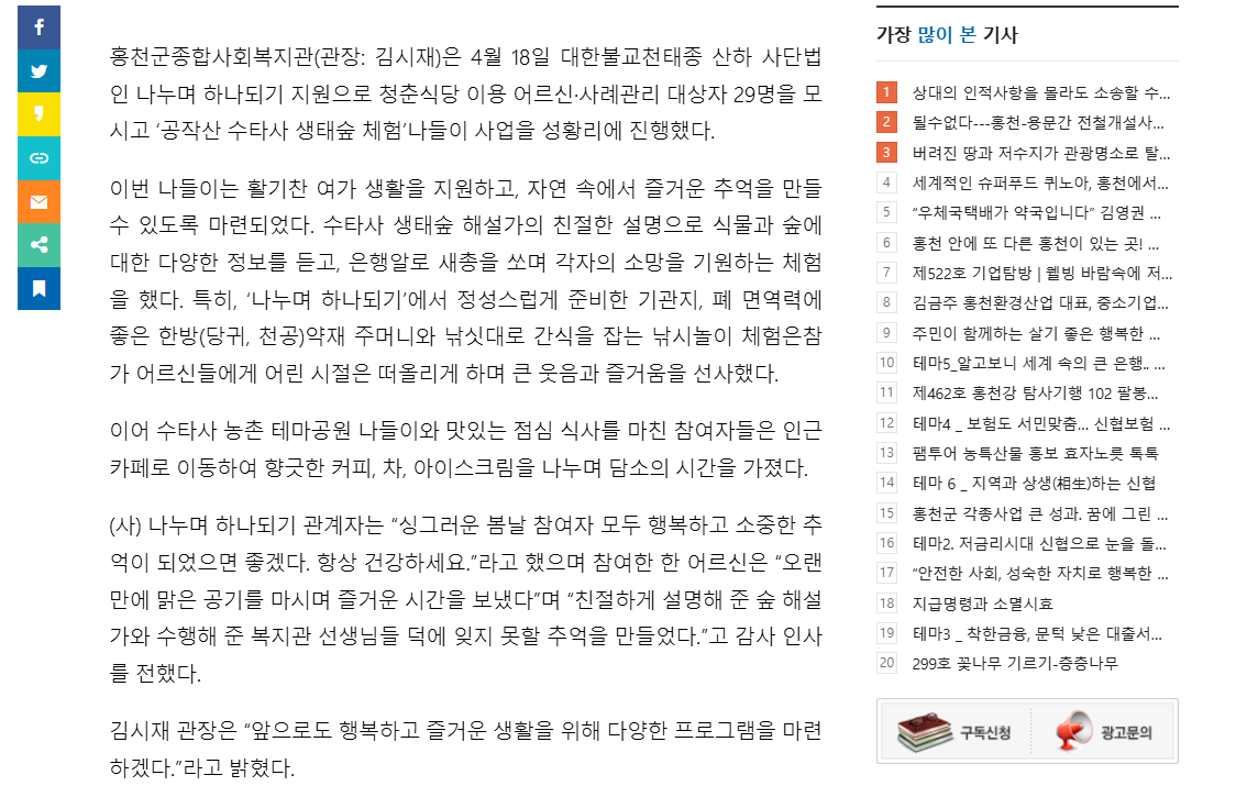 홍천군종합사회복지관, 나들이 사업 "공작산 수타사 생태숲 체험" 진행