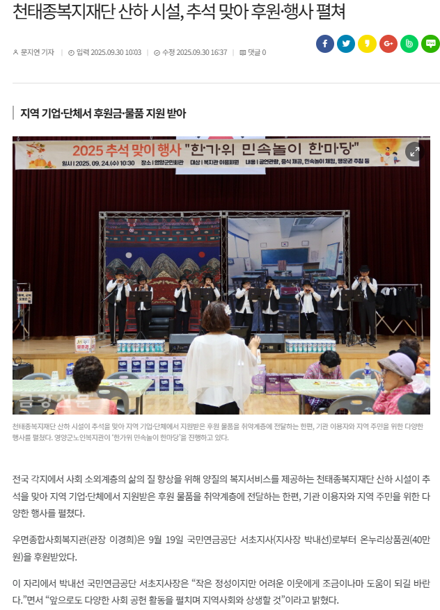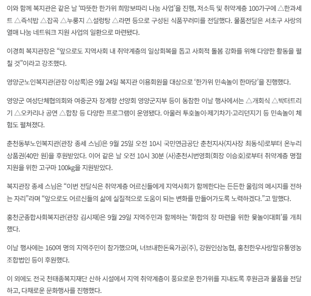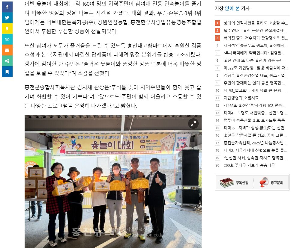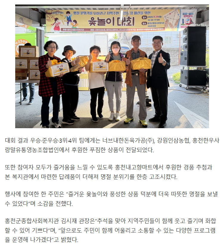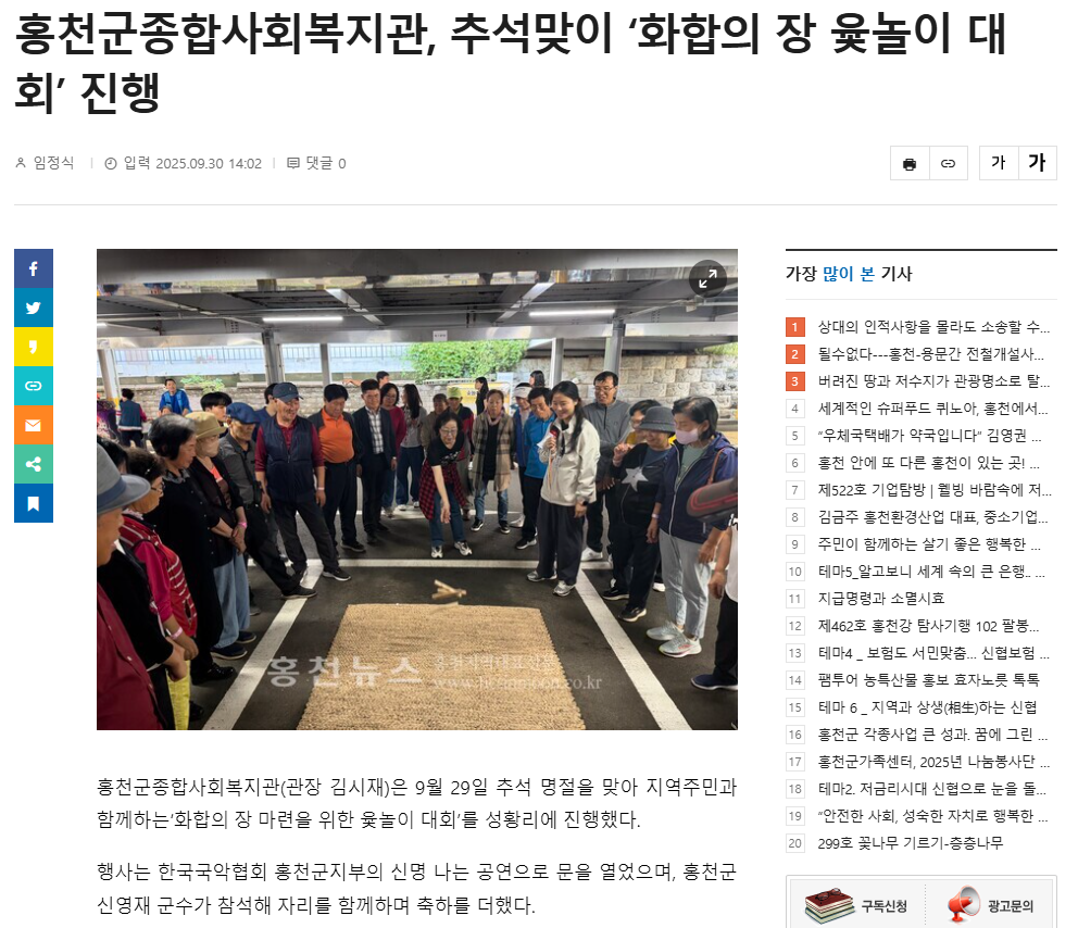- 이전글 홍천군종합사회복지관, 어르신 마음돌봄 자연힐링 프로그램 시작 2025.09.25
