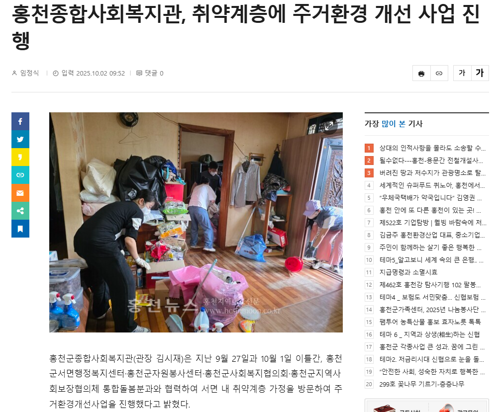 - 다음글 홍천종합사회복지관, ‘ESG 사회환경문제해결 프로젝트’ 2차년도 공모 선정 2025.10.02
