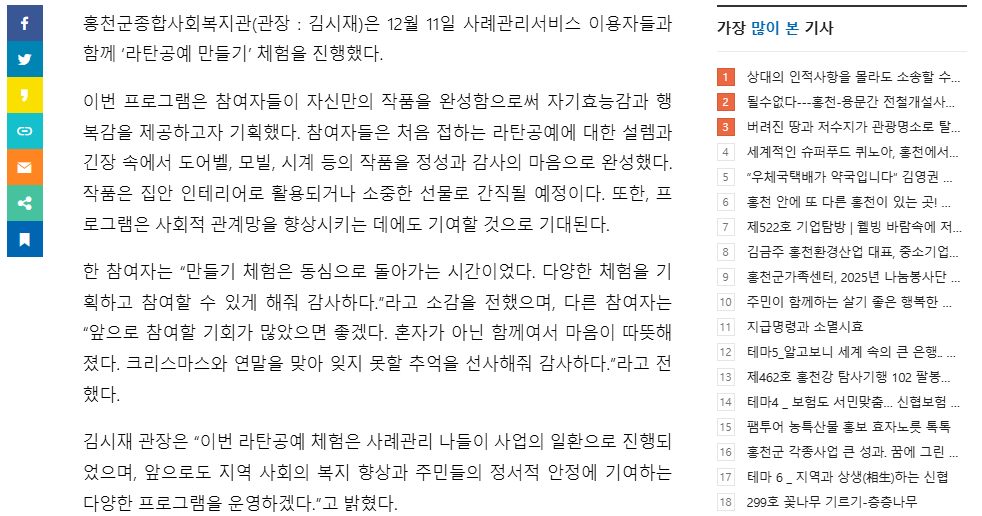 - 다음글 홍천군종합사회복지관, 성탄절 맞아 지역 아동·어르신 대상 행사 진행 2025.12.15