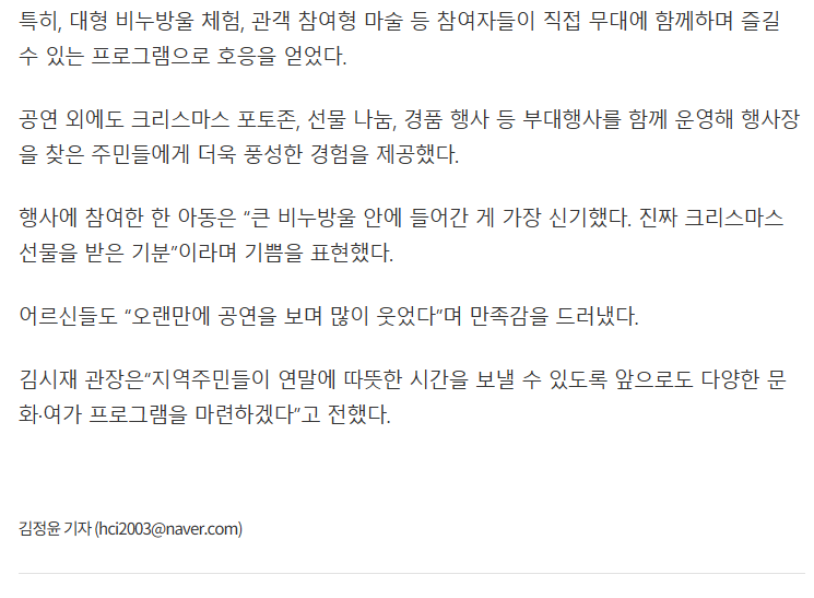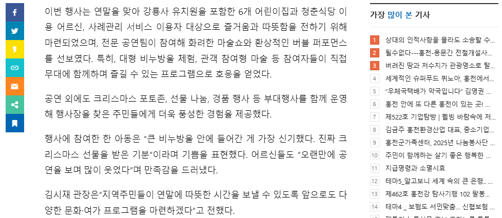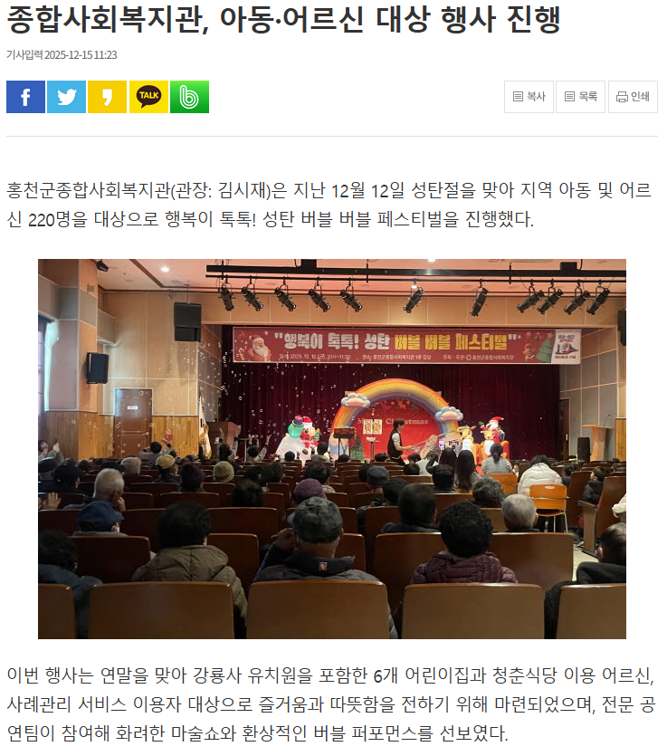 홍천군종합사회복지관, 성탄절 맞아 지역 아동·어르신 대상 행사 진행