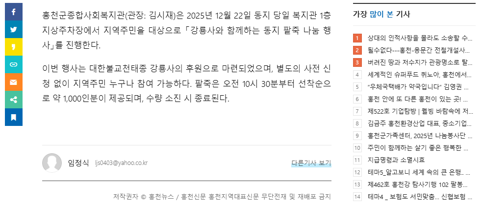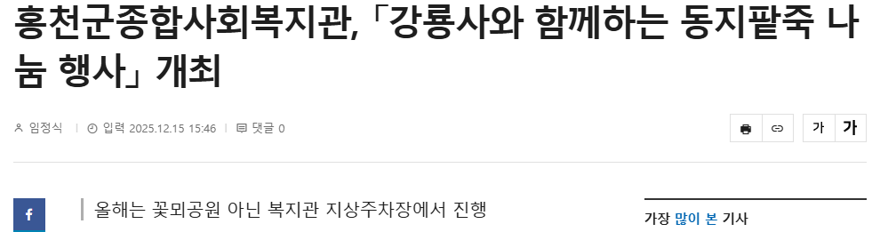 홍천군종합사회복지관, 「강룡사와 함께하는 동지팥죽 나눔 행사」 개최