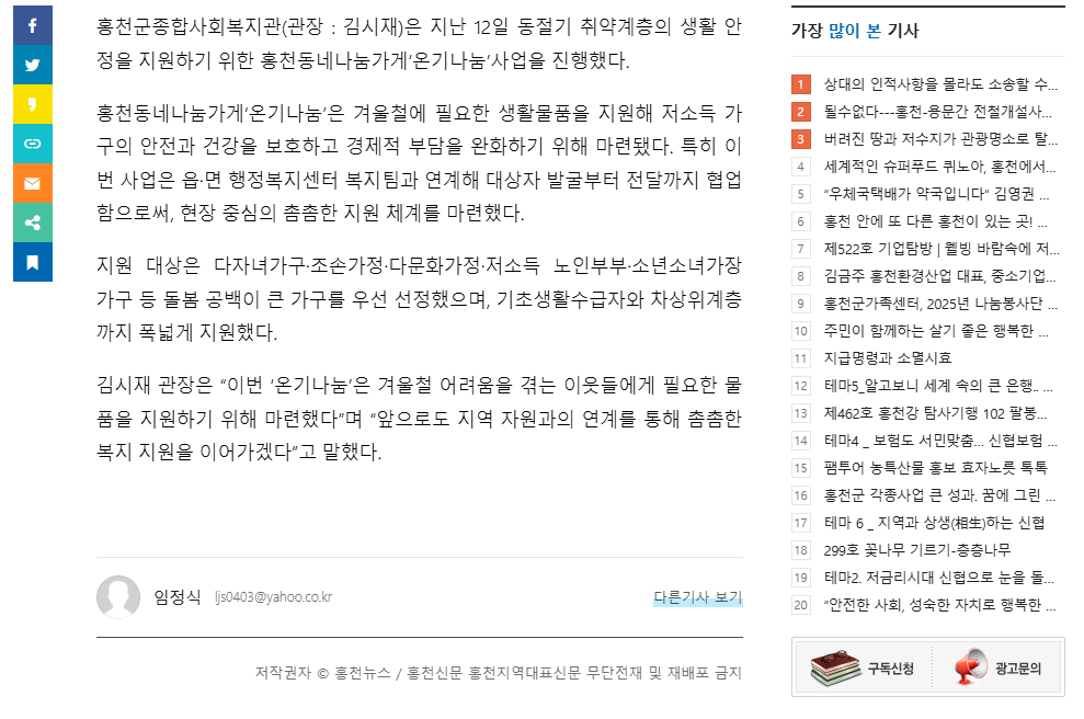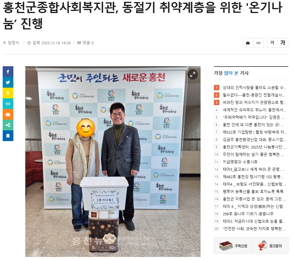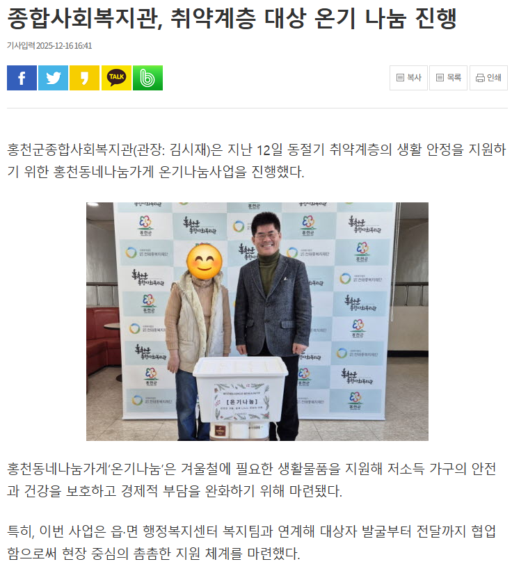 - 이전글 홍천군종합사회복지관, 「강룡사와 함께하는 동지팥죽 나눔 행사」 개최 2025.12.15