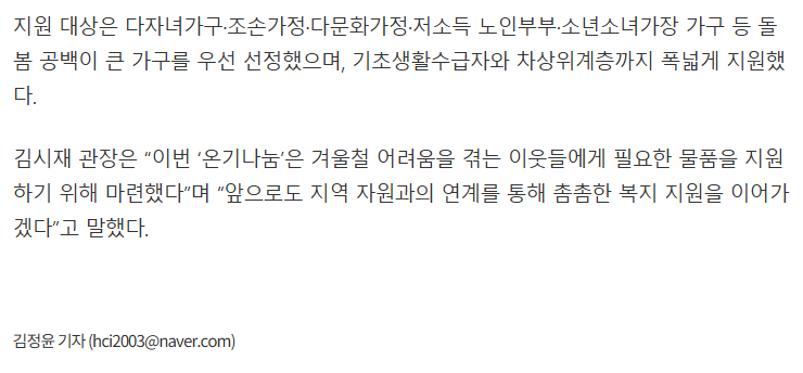 홍천군종합사회복지관, 동절기 취약계층을 위한 '온기나눔’ 진행