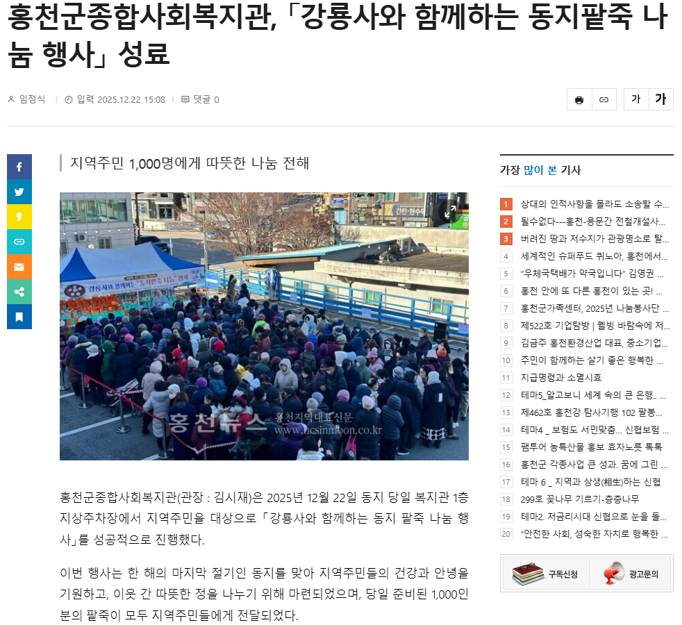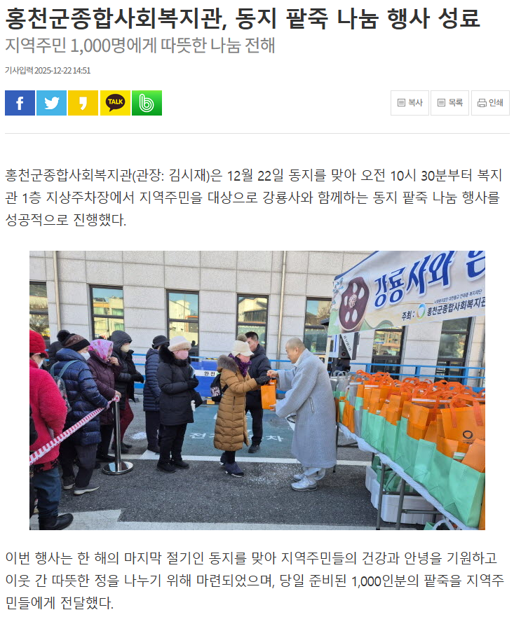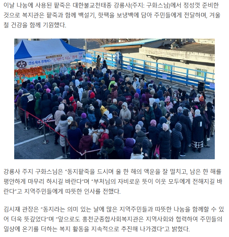 홍천군종합사회복지관, 「강룡사와 함께하는 동지팥죽 나눔 행사」 성료
