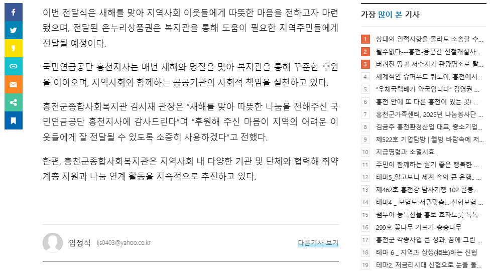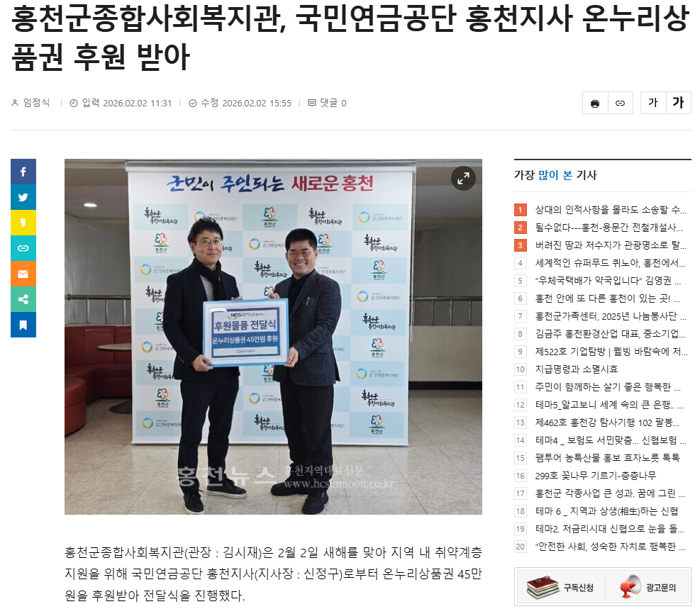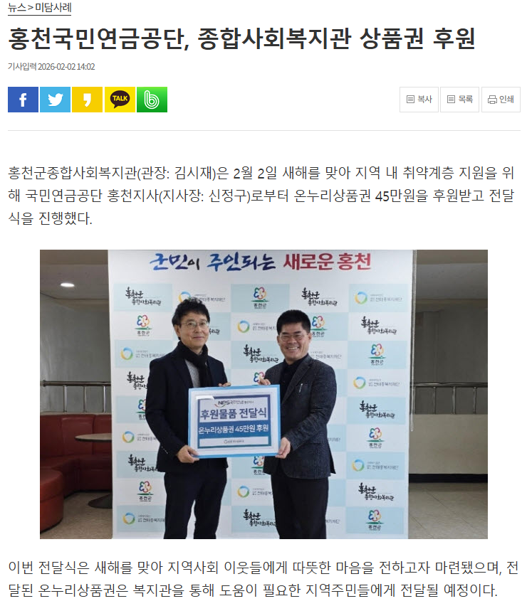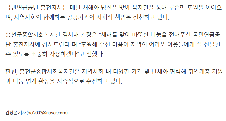 - 이전글 홍천군종합사회복지관, 설 명절 맞아 ‘새해 덕담·안부 나눔 행사’ 운영 2026.01.29