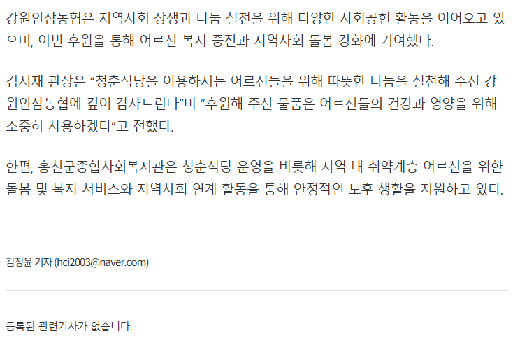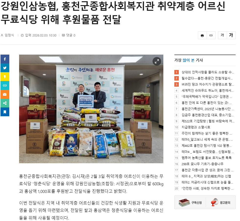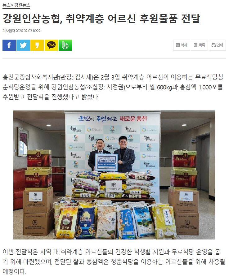 강원인삼농협, 홍천군종합사회복지관 취약계층 어르신 무료식당 위해 후원물품 전달